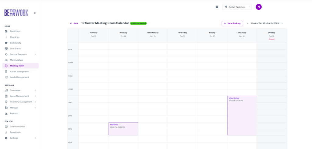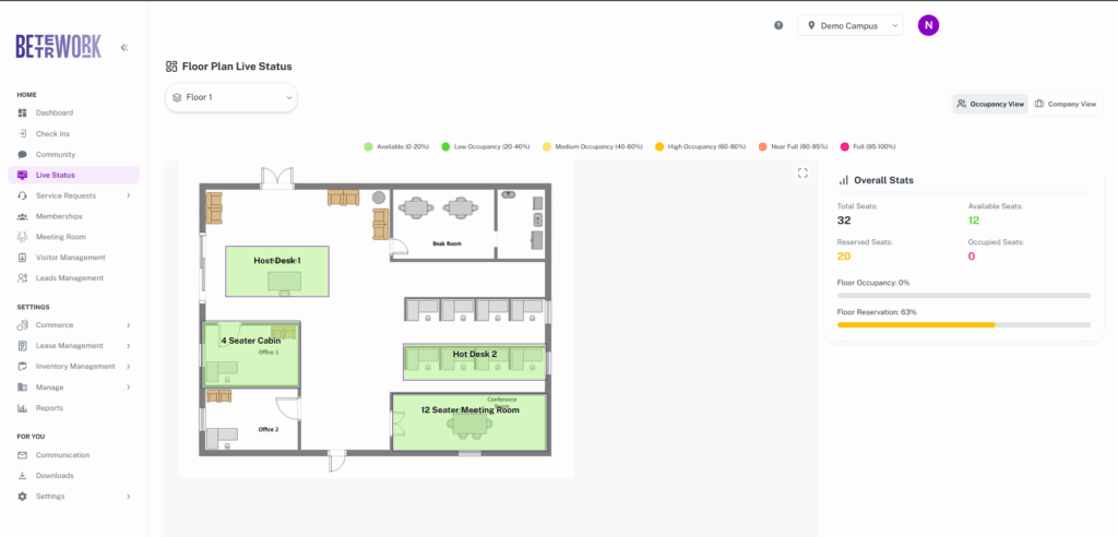 Members can book meeting rooms, order from the café, print documents, raise service requests, and pay their invoices through a single portal. Admins have complete visibility of occupancy, revenue, and performance in real time.