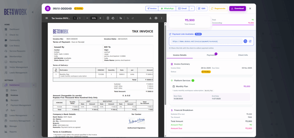 DeskOS feels like it was built specifically for Indian coworking businesses. It understands local tax structures, digital payment trends, and the need for flexible membership management. The platform combines modern design, intelligent automation, and affordability, making it an ideal choice for spaces looking to scale with ease.