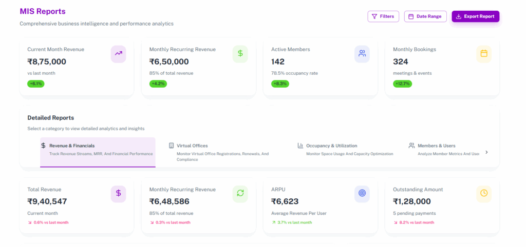You can track occupancy rates, revenue trends, and member activity patterns. It also highlights underutilized areas or peak usage times so you can adjust pricing and layout accordingly.